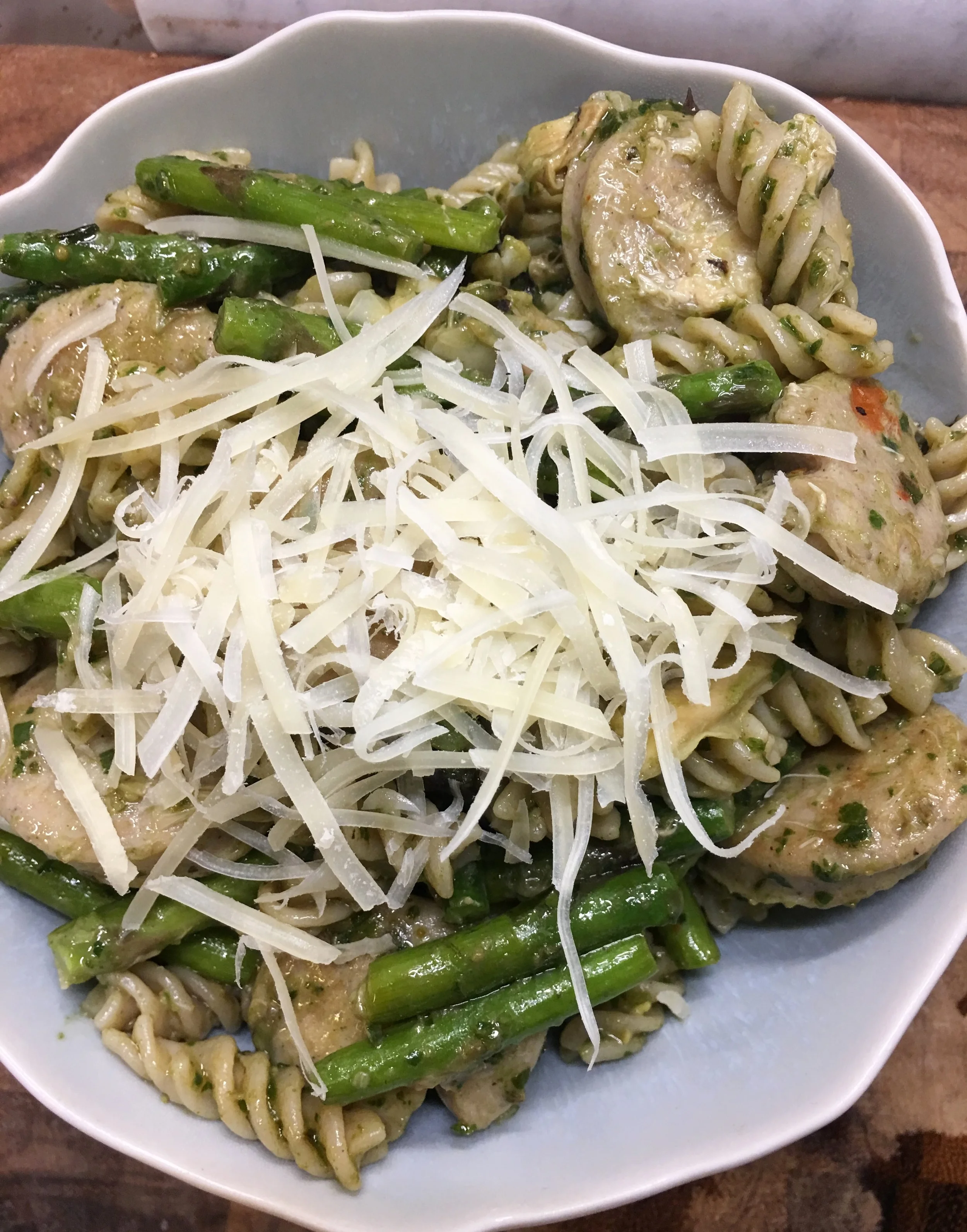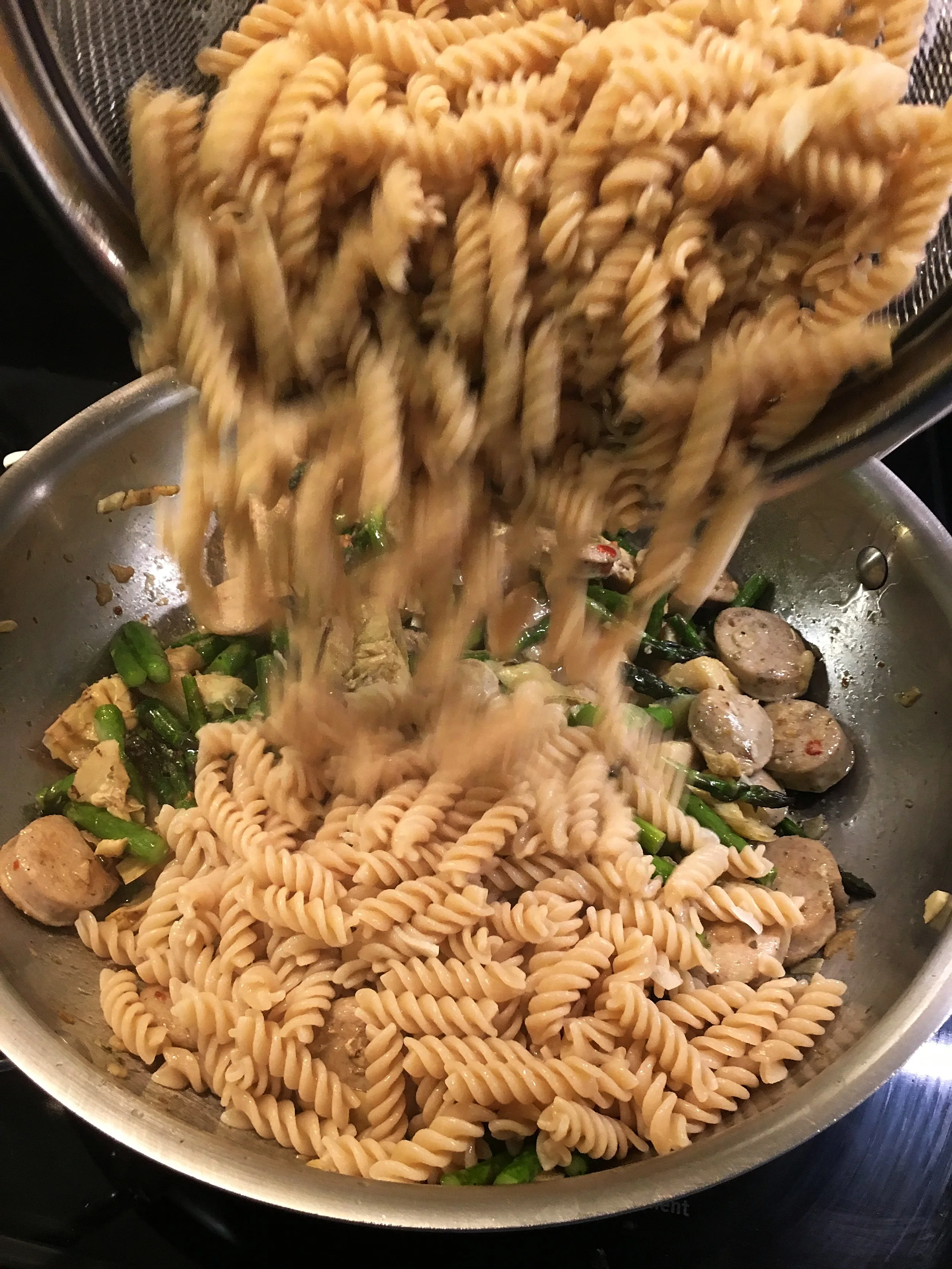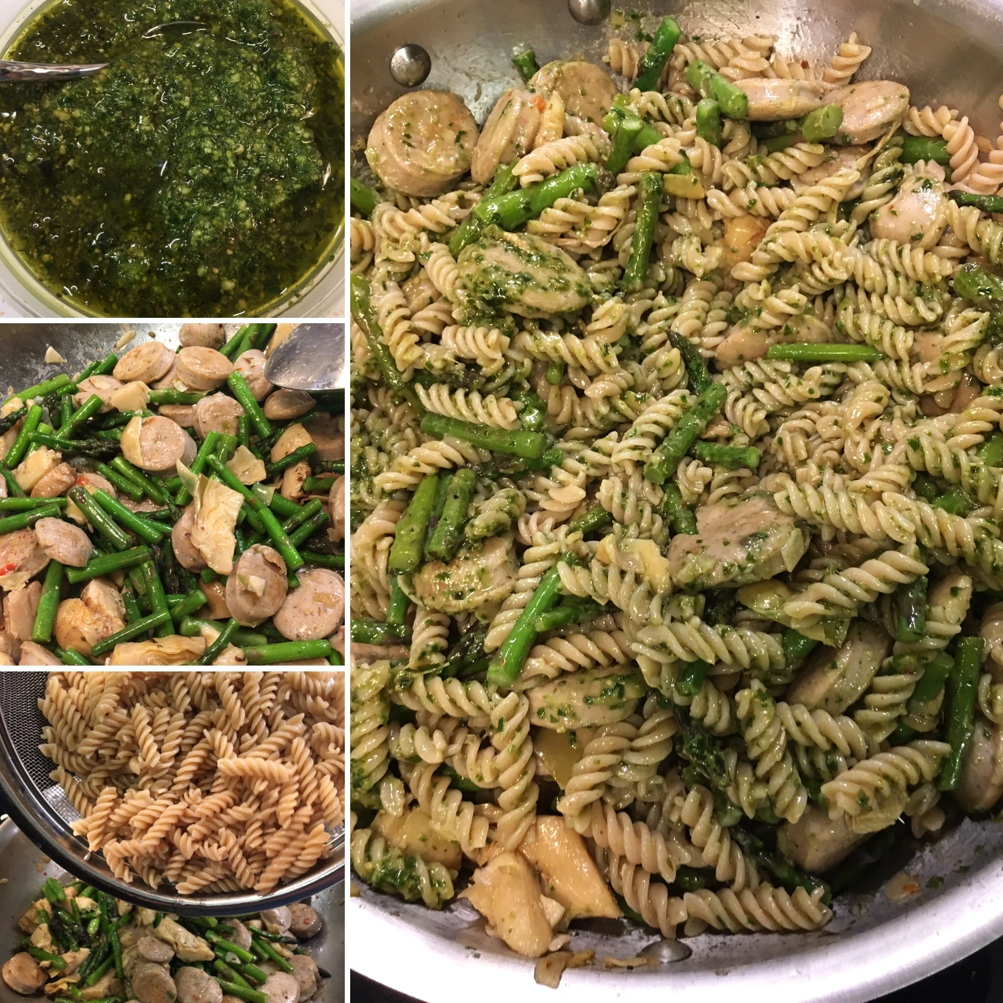So, fast forward to this week, and we are standing in the kitchen debating dinner options, realizing we have a few choices. My husband got back from a business trip, and on his way home from the airport, he graciously stopped by the grocery store for a couple items (oatmeal, if you must know). Reviewing available ingredients, I decided we should make a simple pasta dish with pre-made chicken sausage (yes, cheating, oh well), asparagus, artichokes, and pesto from the local farm we visit on weekends.
