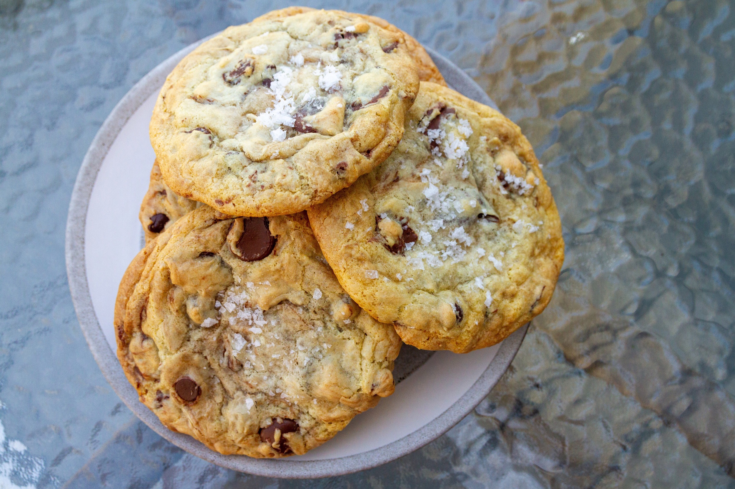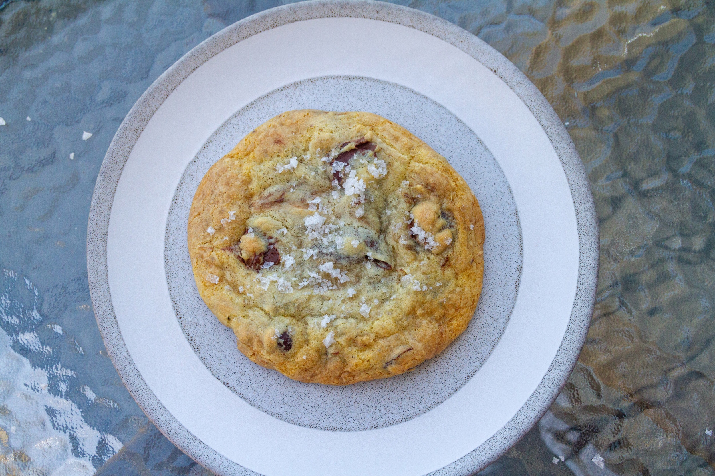 So, what’s the secret ingredient? What makes these cookies simply pop? Crème fraîche! Not familiar? This is a French-style cultured cream that’s somewhat thick and easily spreadable (softer than cream cheese). I guarantee that is what is making this cookie so irresistible. That and the overflowing chocolate, the salt sprinkle on top, and never over-baking.