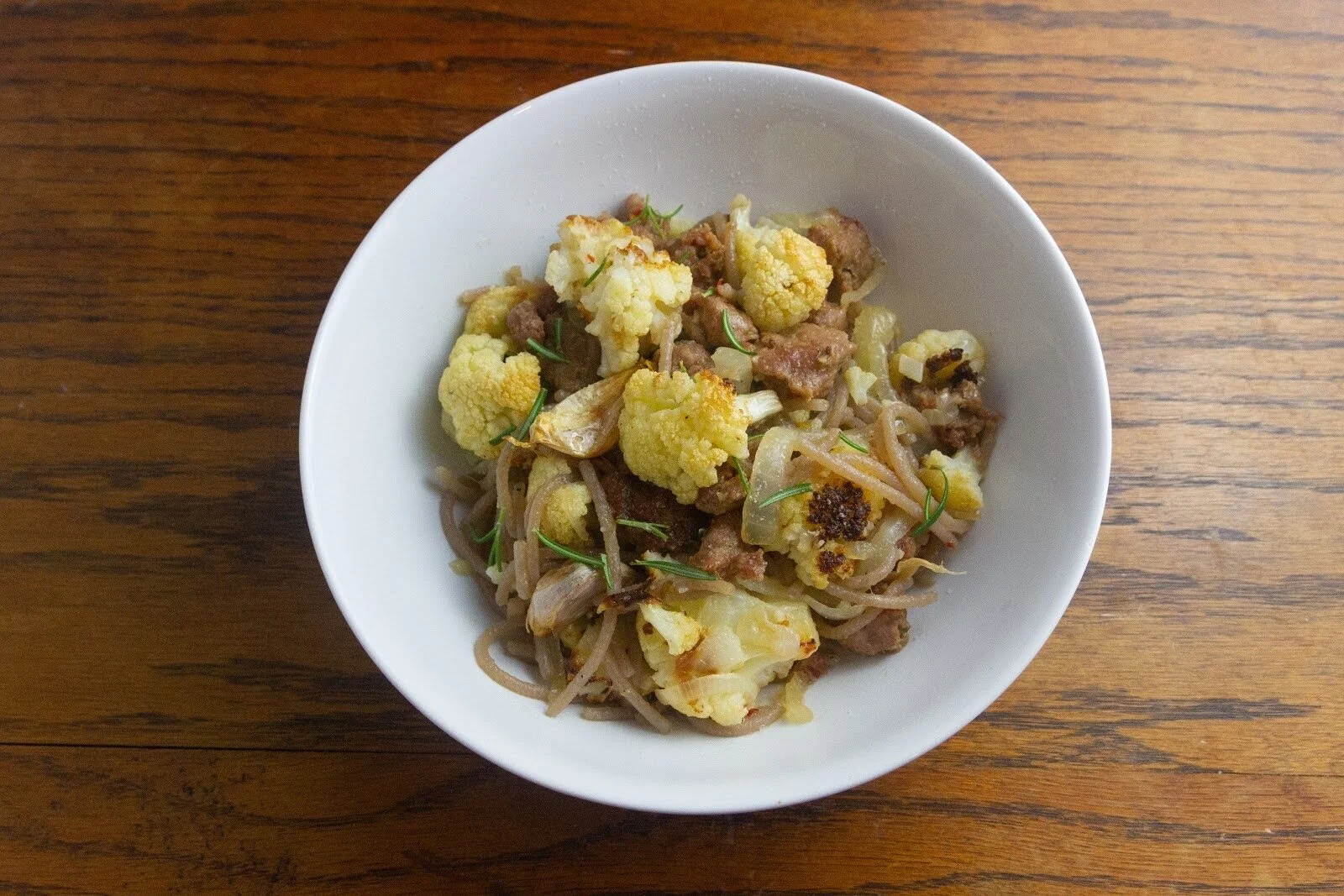One of the best discoveries since cooking with cauliflower has been realizing how delicious it is when mixed with pasta. So, we took an otherwise unexciting vegetable and added it to our classic “veggie and sausage pasta,” thus creating one amazing meal. This dish included hot Italian sausage and Jovial Foods grain free cassava pasta.