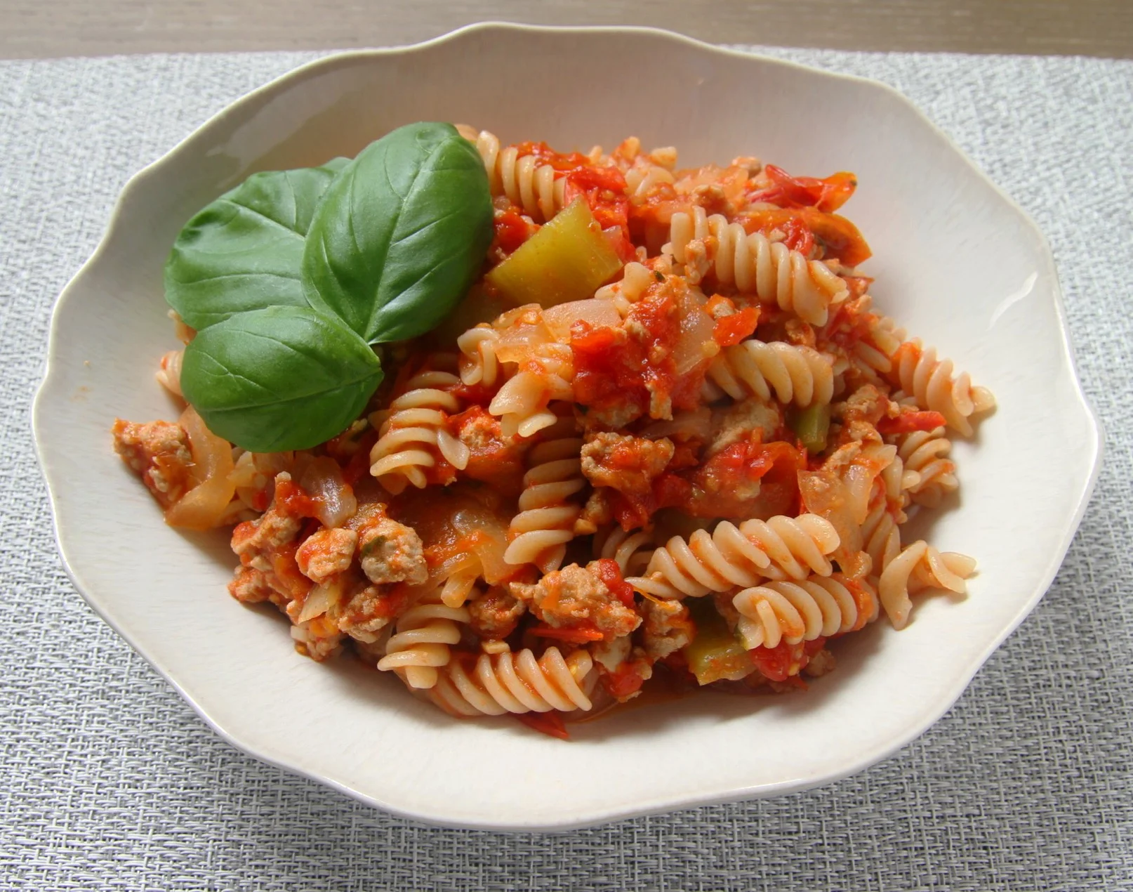 Turkey meat sauce with Holland peppers and onions mixed with GF fusilli pasta.