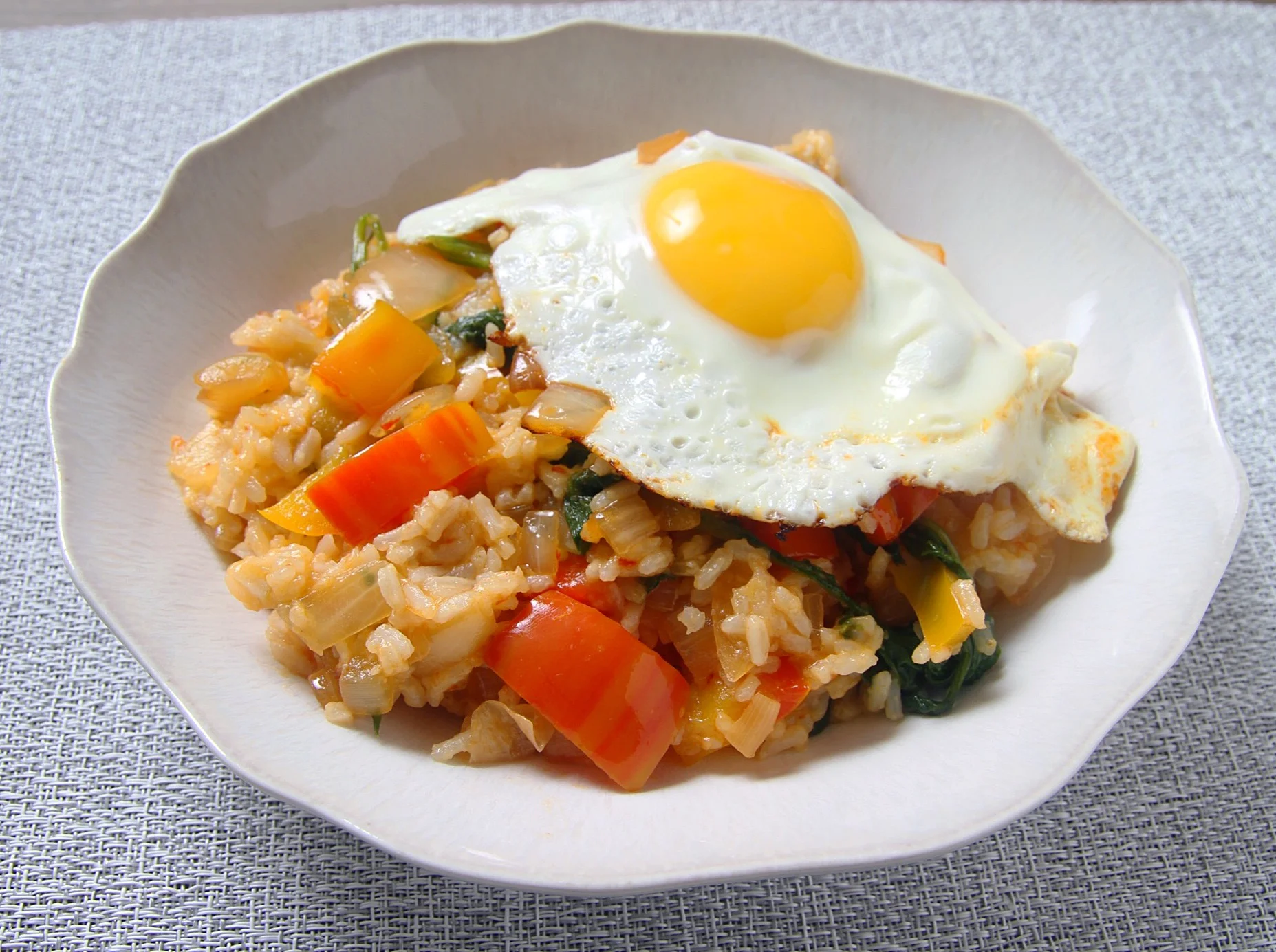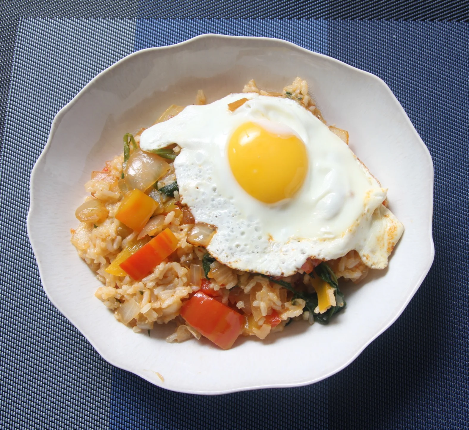 Jasmine rice with peppers, onions, and spinach, topped with an egg.