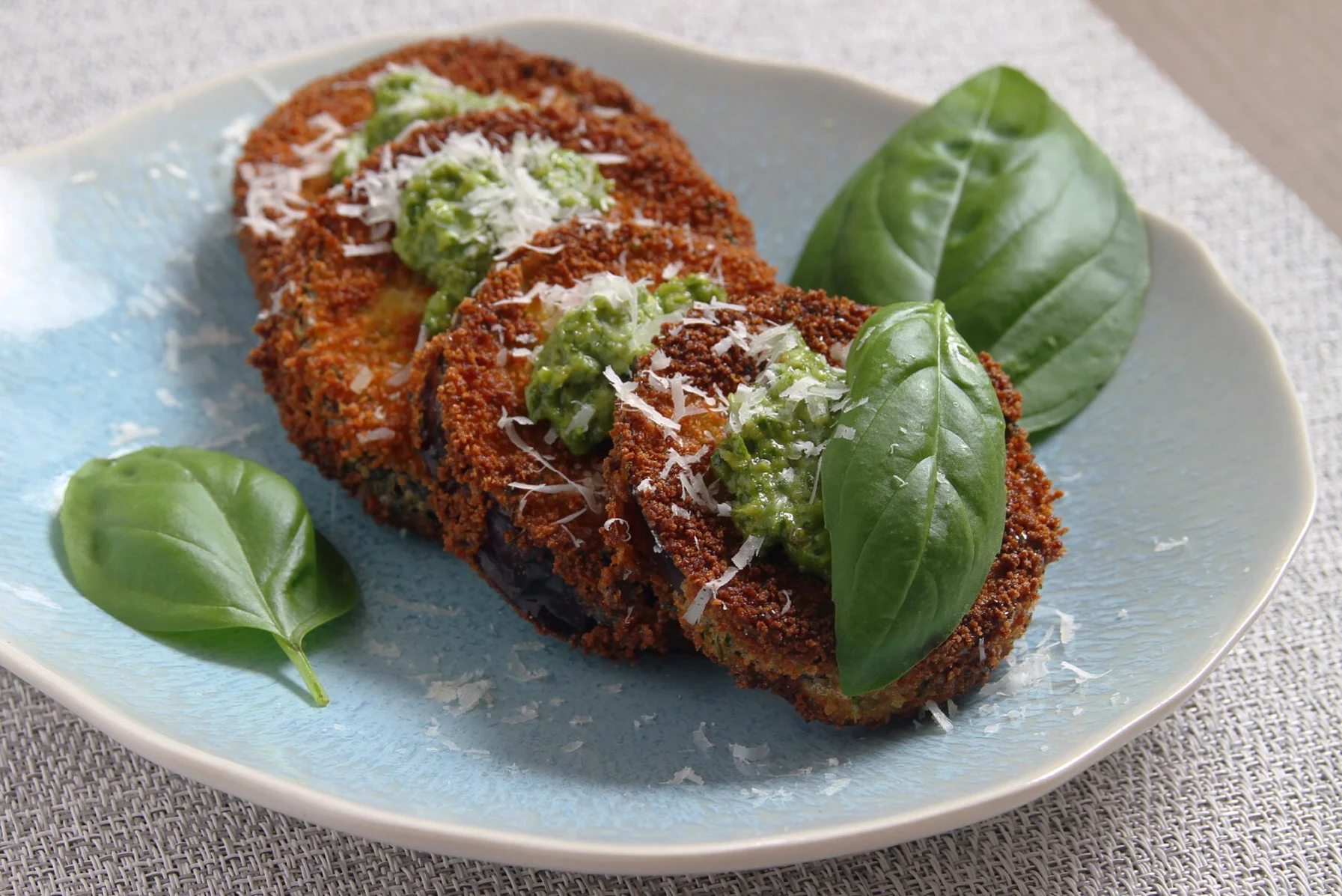 Crispy eggplant topped with homemade basil pesto and shaved Parmesan.