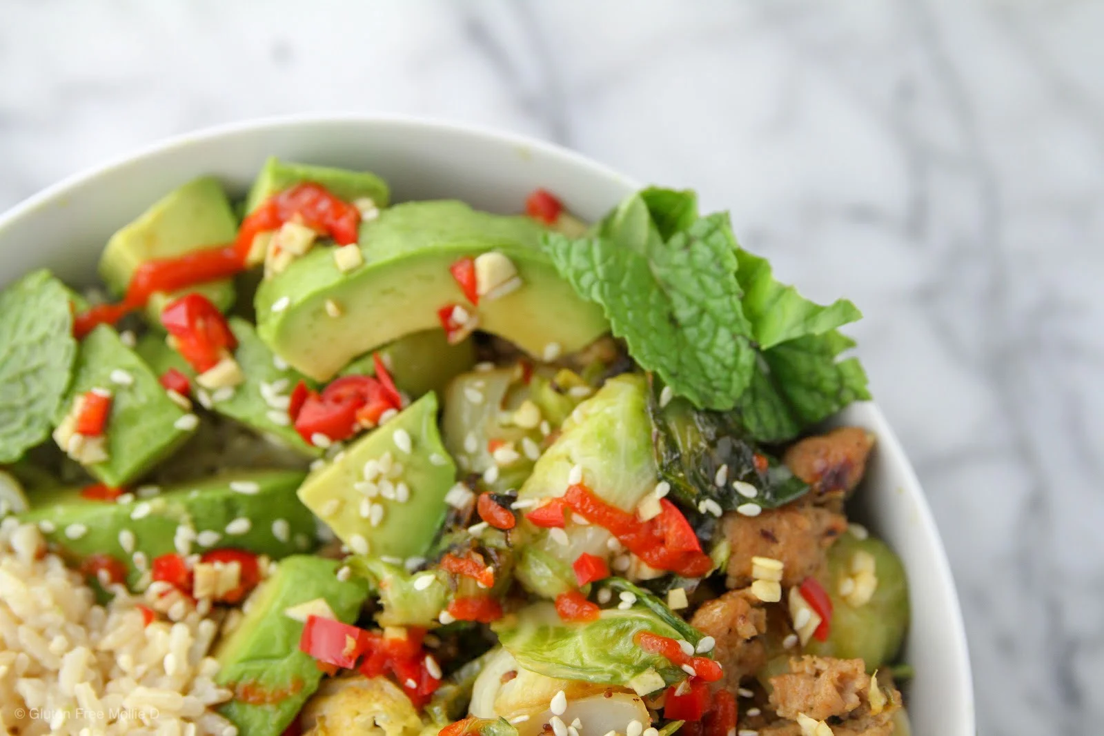 The most rewarding part of this dinner was the amazing flavors that got crammed into each bite. OMG! Coconut rice, Brussels sprouts, chicken sausage, avocado, and sriracha - what a blend!